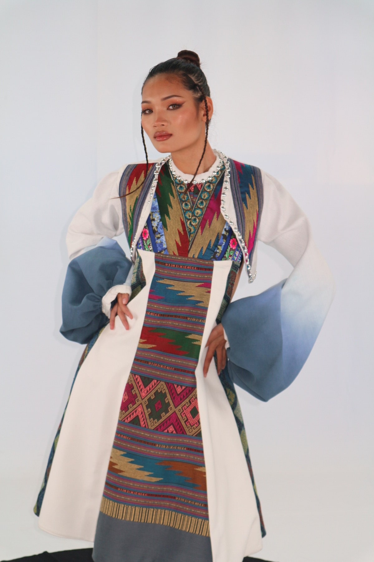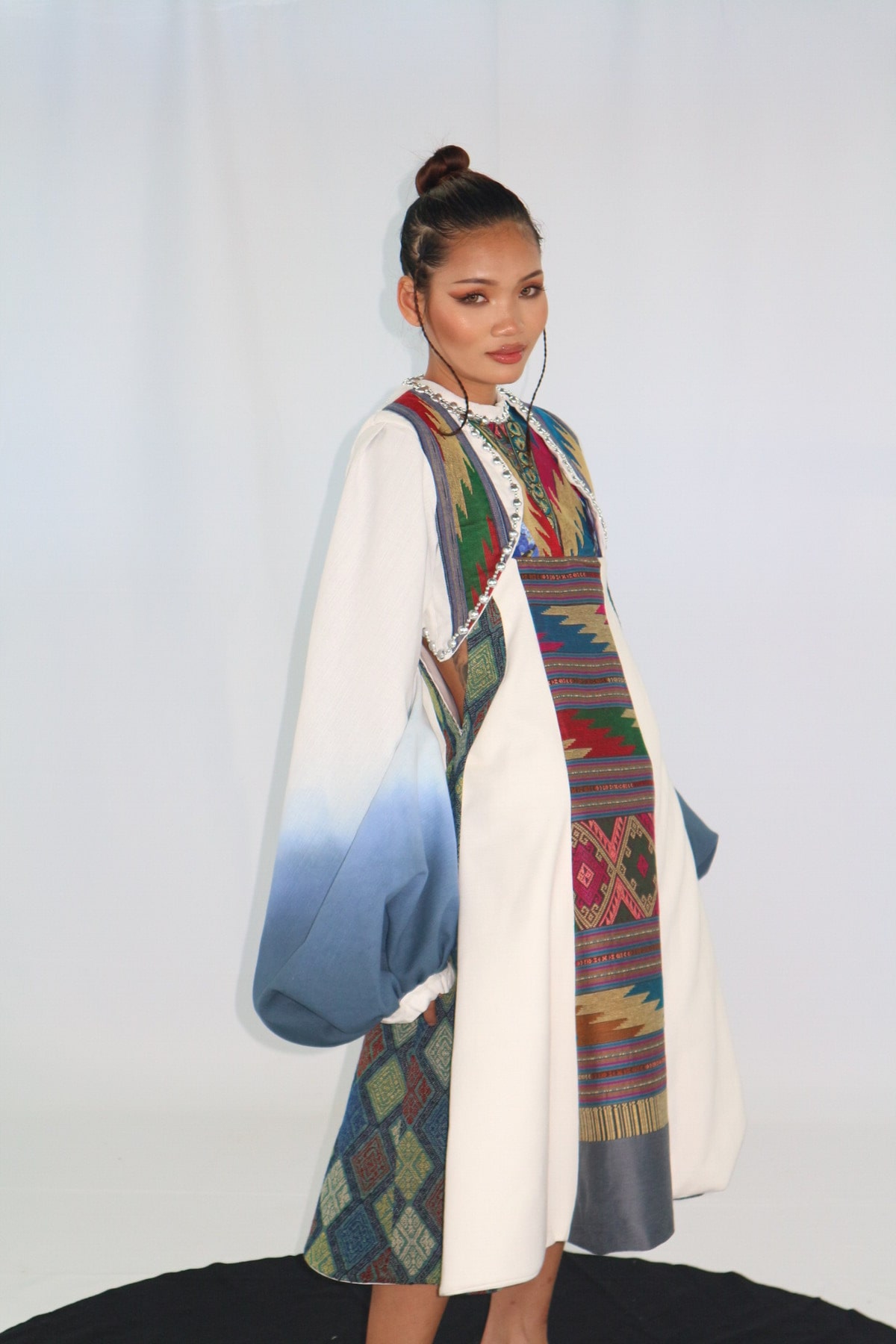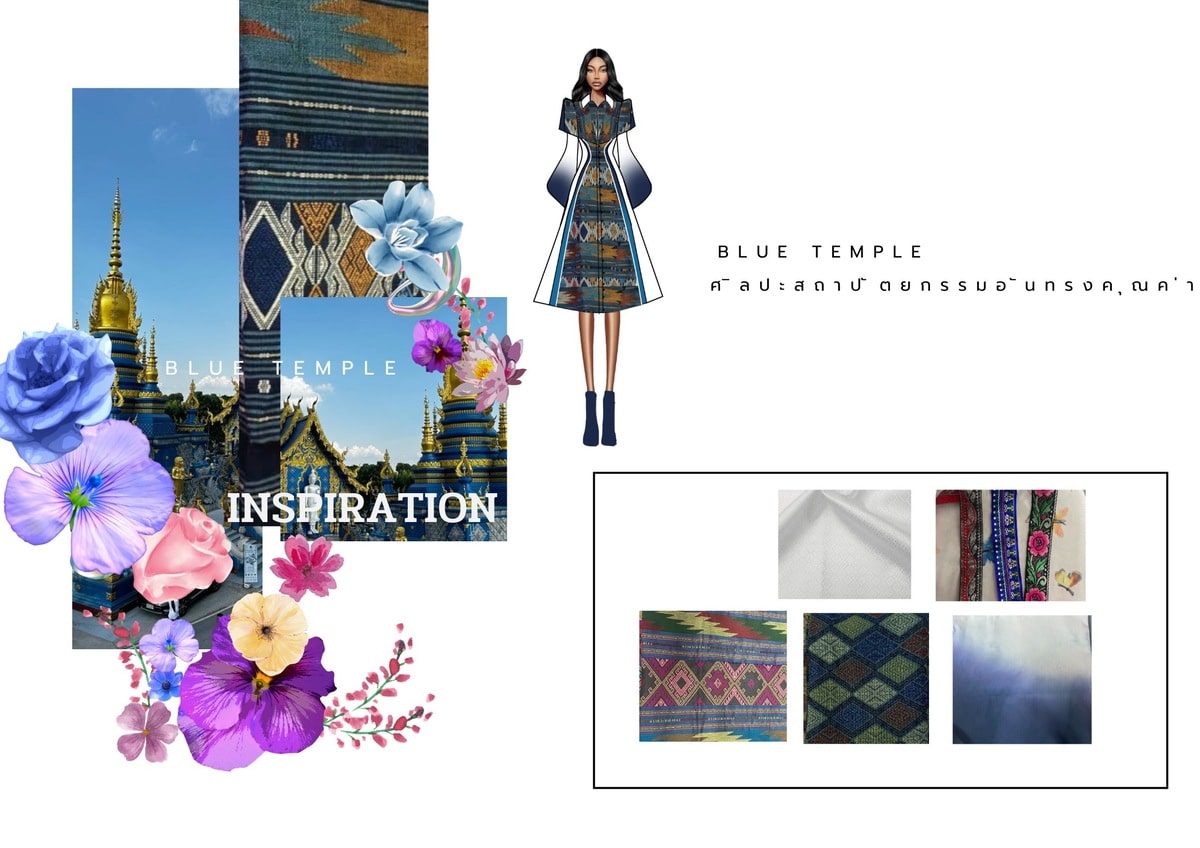 ได้รับแรงบันดาบใจจากโทนสี วัดร่องเสือเต้น ตั้งอยู่ที่หมู่บ้านร่องเสือเต้น ตำบลริมกก อำเภอเมือง จังหวัดเชียงราย และกำลังเป็นสถานที่ท่องเที่ยวแห่งศรัทธาที่ถูกพูดถึงในเรื่องของเอกลักษณ์ความงดงามทางสถาปัตยกรรม อันเกิดจากการสร้างสรรค์ศิลปินชาวบ้าน ผู้ออกแบบจึงได้นำเอาผ้าทอไทยลื้อของชาติติพันธ์เชียงรายมาออกแบบและใช้เทคนิคการยอมผ้าหลายสีบนผ้าไหมตัดต่อเพื่อเห็นถึงชนิดของผ้าแต่ละภูมิภาคโดยเรื่องราวของสถาปัตยกรรมวัดร่องเสือเต้นอันทรงคุณค่ามายกระดับและเป็นที่กล่าวถึงผ่านชุดนี้ BLUE TEMPLE