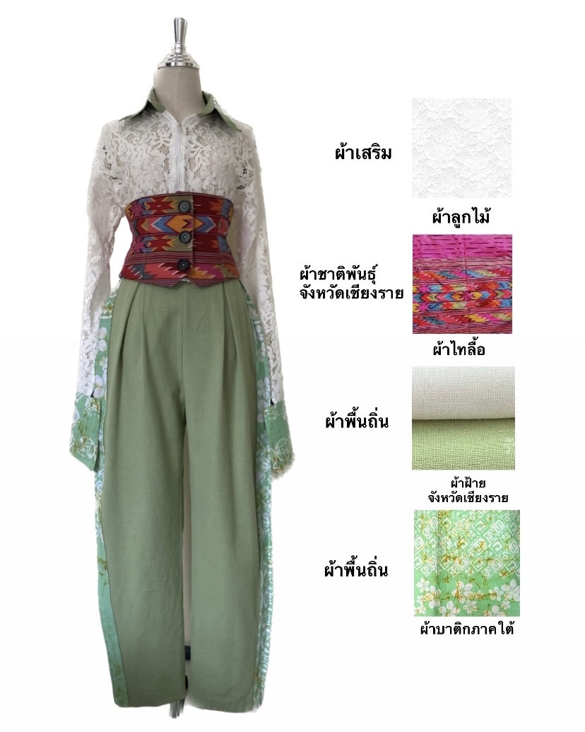 ผลงานการออกแบบแฟชั่นที่ถ่ายทอดอัตลักษณ์ความงดงามของหัตถศิลป์ไทย ผ่านการผสมผสานลวดลายผ้าจากสองภูมิภาค ได้แก่ ผ้าไทลื้อจากภาคเหนือ และผ้าบาติกจากภาคใต้ สู่ชุดทำงานร่วมสมัยที่สามารถสวมใส่ได้ทั้งสุภาพบุรุษและสุภาพสตรี