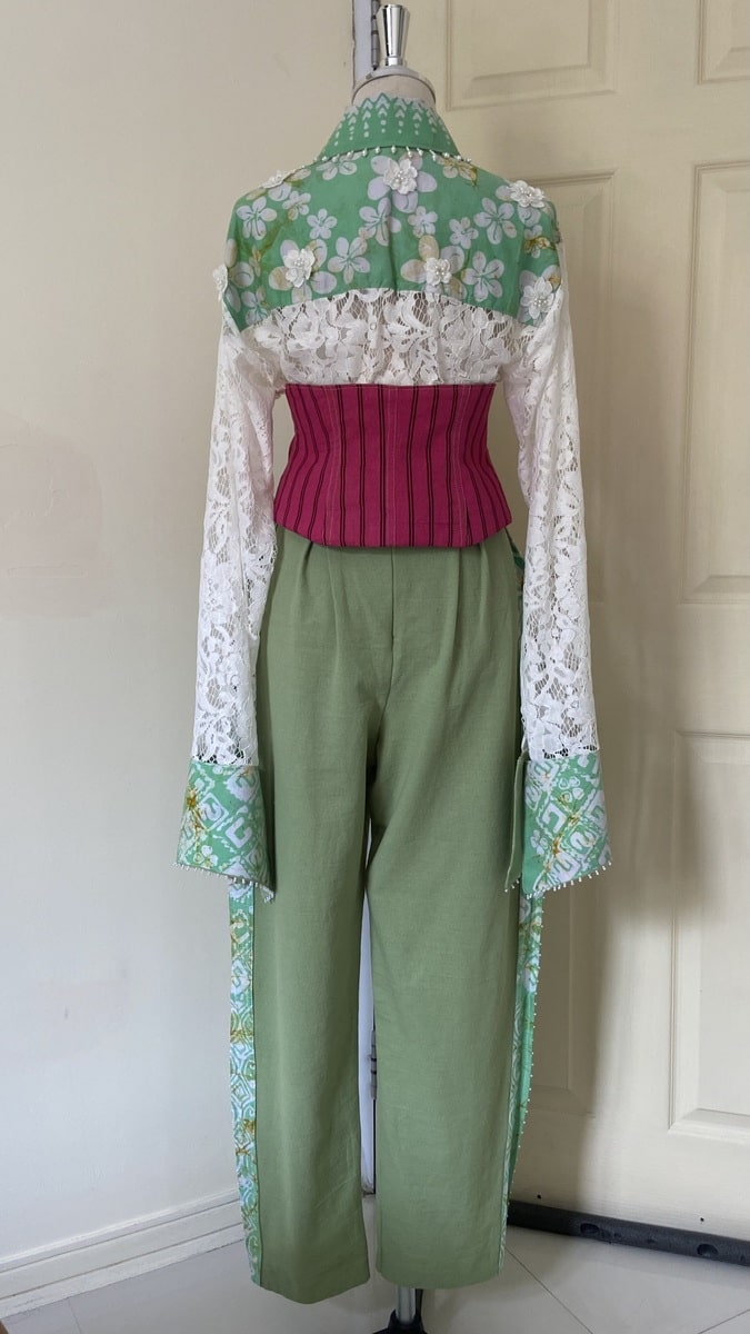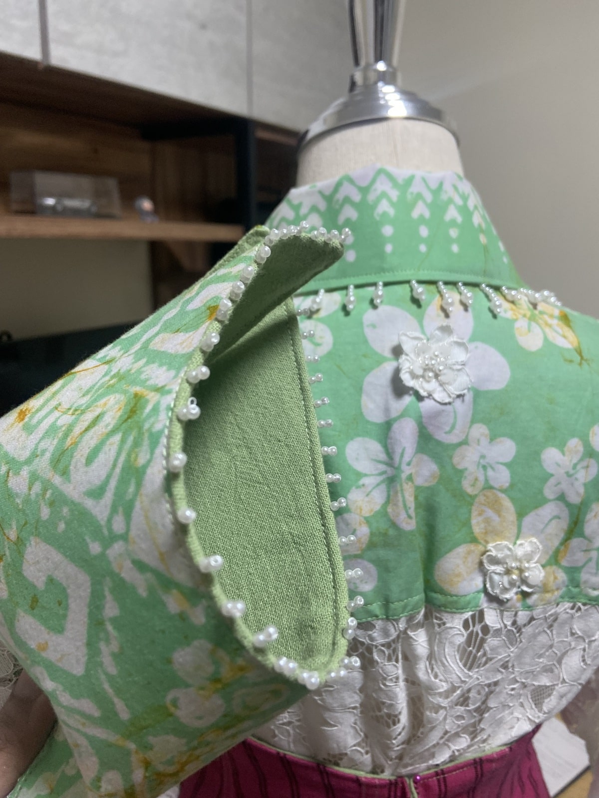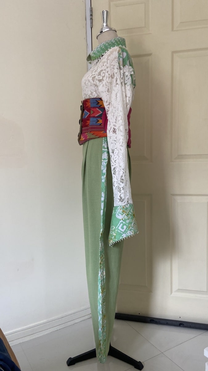 องค์ประกอบหลักของชุดประกอบด้วยกางเกงขายาว ตัดเย็บจากผ้าบาติกที่นำมาผสมผสานกับผ้าฝ้าย เพื่อความสบายในการสวมใส่ พร้อมลวดลายที่โดดเด่นสะดุดตา ตัวเสื้อหลักใช้ผ้าลูกไม้เพื่อสร้างมิติความอ่อนช้อย อบอุ่น เสริมด้วยปกเสื้อและแขนเสื้อที่เลือกใช้ผ้าบาติกเพื่อสะท้อนอัตลักษณ์ของภาคใต้ได้อย่างนุ่มนวล