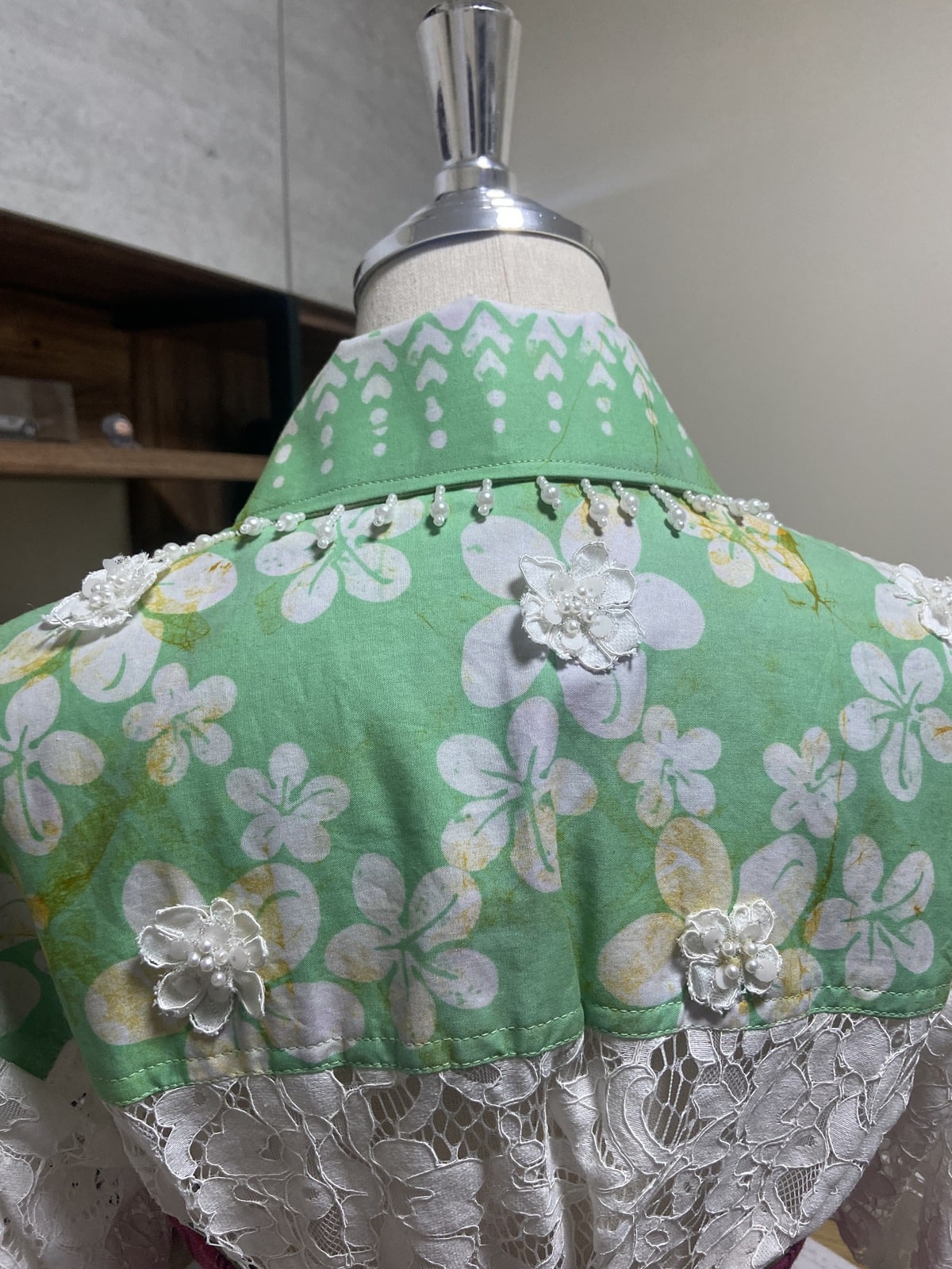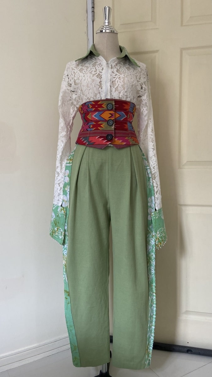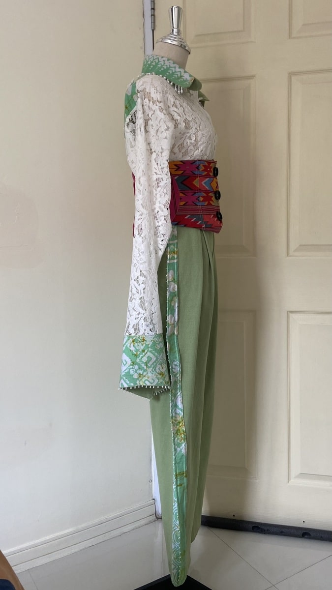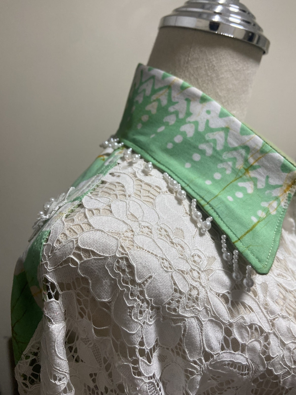 องค์ประกอบหลักของชุดประกอบด้วยกางเกงขายาว ตัดเย็บจากผ้าบาติกที่นำมาผสมผสานกับผ้าฝ้าย เพื่อความสบายในการสวมใส่ พร้อมลวดลายที่โดดเด่นสะดุดตา ตัวเสื้อหลักใช้ผ้าลูกไม้เพื่อสร้างมิติความอ่อนช้อย อบอุ่น เสริมด้วยปกเสื้อและแขนเสื้อที่เลือกใช้ผ้าบาติกเพื่อสะท้อนอัตลักษณ์ของภาคใต้ได้อย่างนุ่มนวล