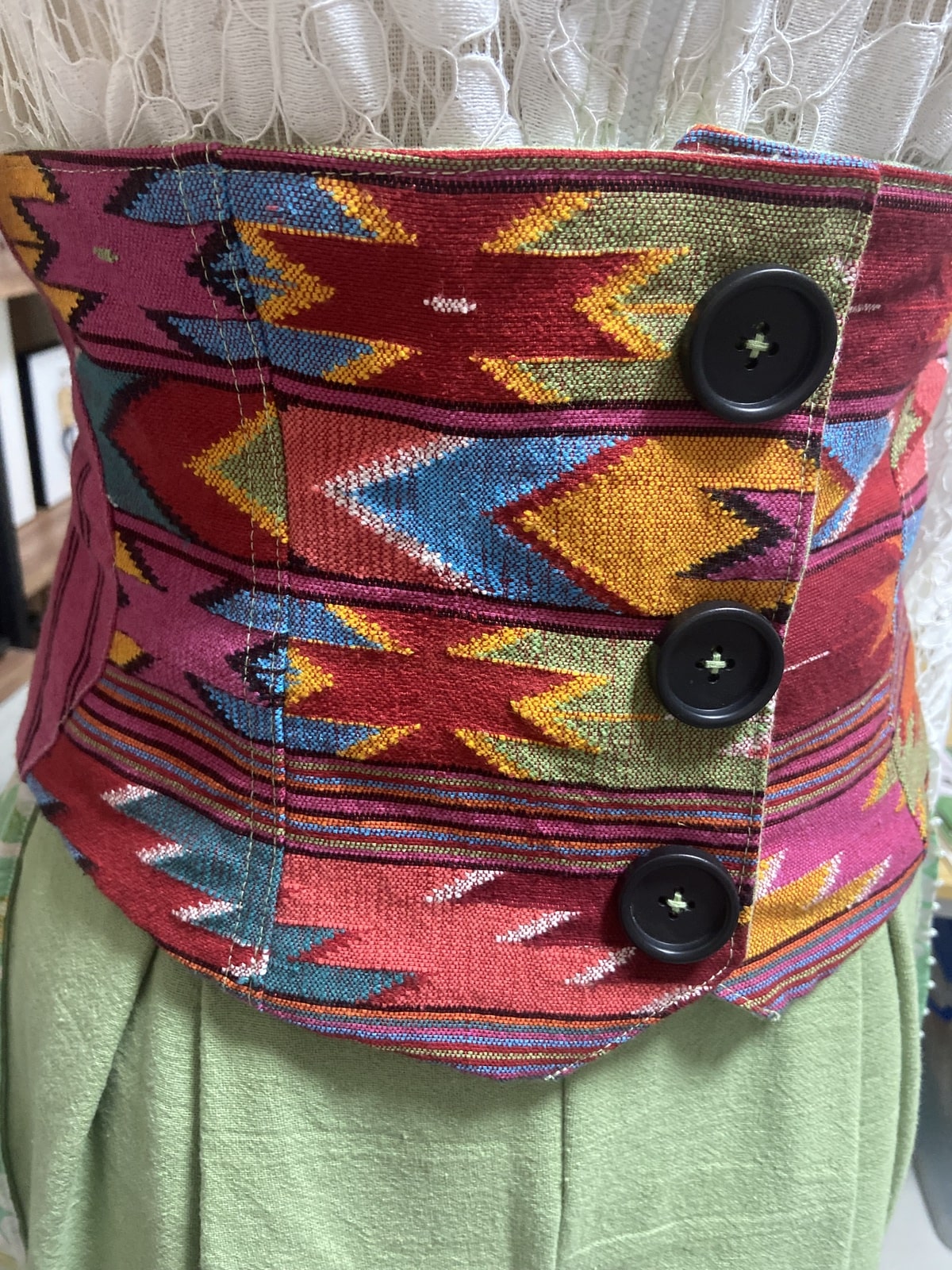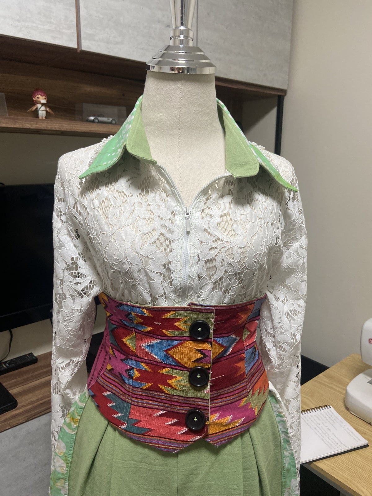 จุดเด่นสำคัญของชุดนี้อยู่ที่ “คอร์เซ็ต” ซึ่งตัดเย็บจากผ้าไทลื้อของจังหวัดเชียงราย เป็นการนำลายทอพื้นเมืองอันทรงคุณค่ามาตีความใหม่อย่างสร้างสรรค์ เสริมความสง่างาม และสร้างภาพลักษณ์อันทรงพลังให้แก่ผู้สวมใส่