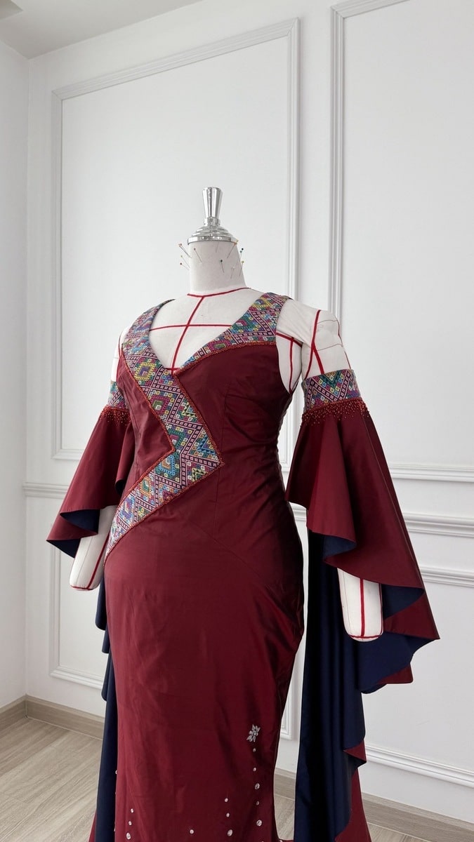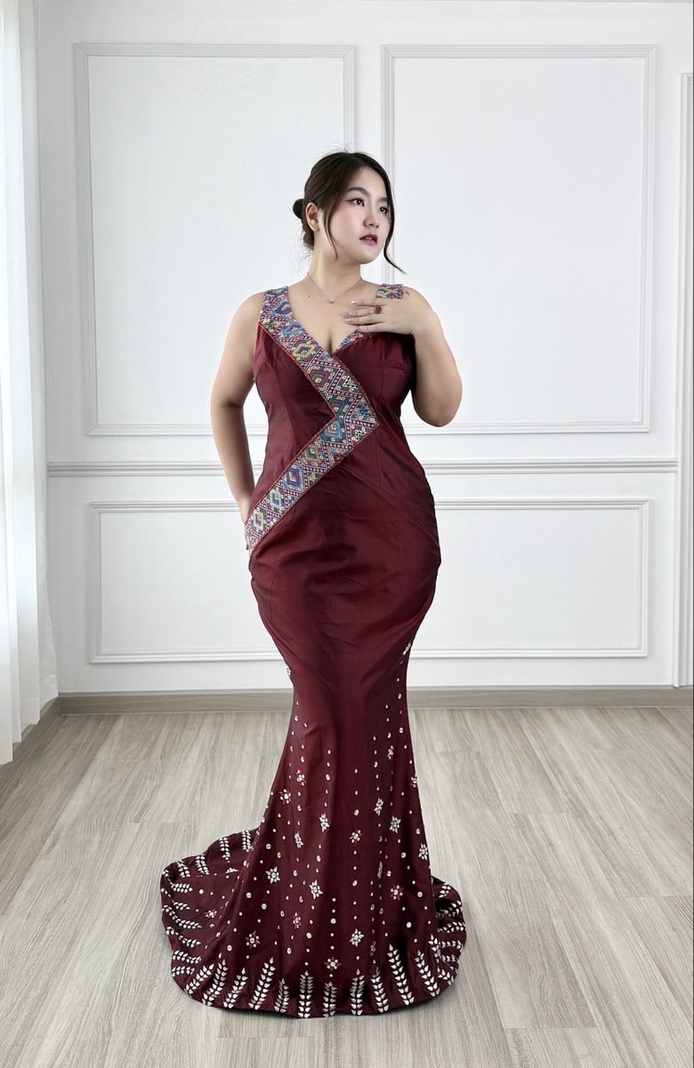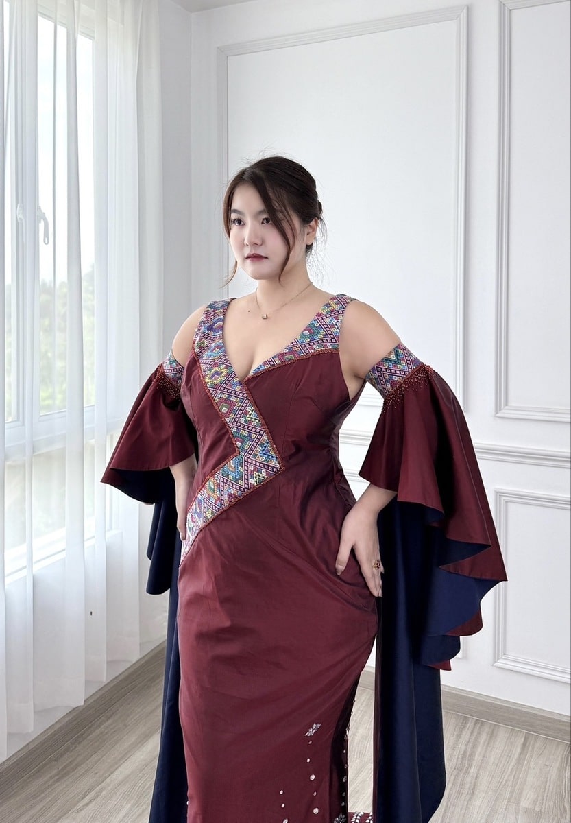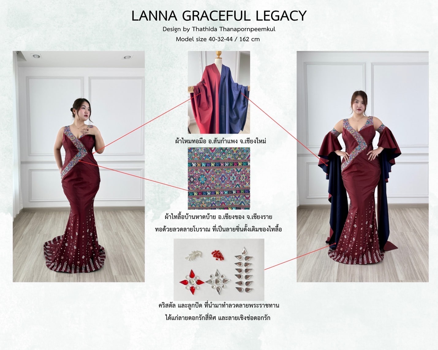 ตัวเดรสหลักเลือกใช้ผ้าไหมทอมือ ของ อ.สันกําแพง จ.เชียงใหม่ และผ้าชาติพันธ์ที่เป็นโจทย์หลักในครั้งนี้ โดยนำมาเป็นจุดเด่นของการวางลายชุดให้เป็นเส้นนําสายตา เพื่อให้รูปร่างดูเพรียว สง่า เลือกใช้เป็นผ้าซิ่นไทยลื้อ บ้านหาดบ้าย อ.เชียงของ จ.เชียงราย ซึ่งเป็นการทอด้วยลวดลายโบราณที่ทรงคุณค่า และเป็นลายซิ่นดั้งเดิมของไทลื้อมาประยุกต์ให้เข้ากับผ้าไหม เพื่อเชื่อมโยงวัฒนธรรมของทั้ง 2 จังหวัด ที่มีรากเหง้าร่วมกันมาอย่างยาวนาน และนำเอาคริสตัลมาตีความหมายใหม่ในมุมมองร่วมสมัย โดยทำเป็นลายพระราชทาน ได้แก่ลายดอกรักสี่ทิศ และลายเชิงช่อดอกรัก เพิ่มความพิเศษให้กับตัวชุด สื่อถึงความอ่อนโยนของผู้หญิงล้านนา