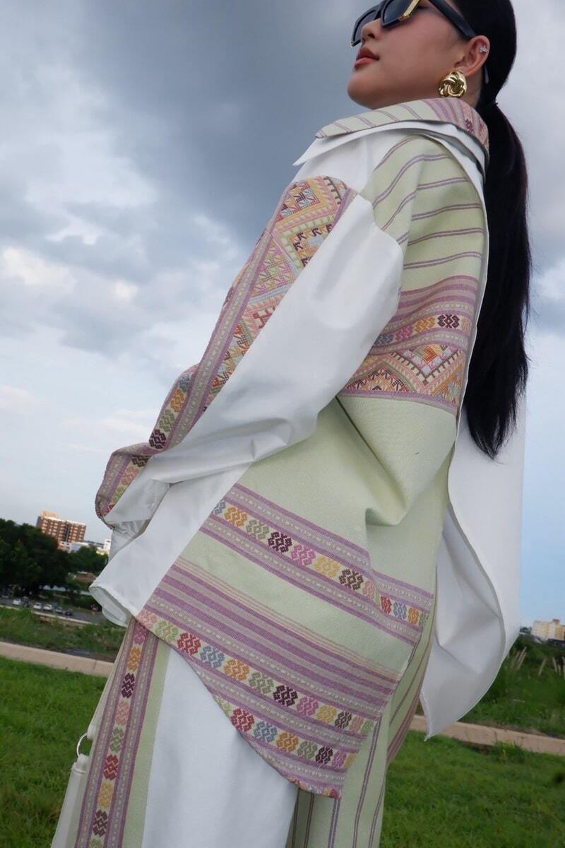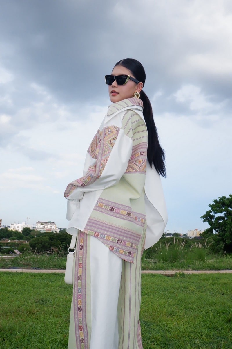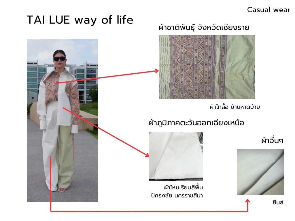 วิถีชีวิตเรียบง่ายแต่เปี่ยมด้วยศิลปะของชาวไทลื้อหาดย้าย จังหวัดเชียงราย ซึ่งเป็นกลุ่มชาติพันธุ์ที่มีภูมิปัญญาในการทอผ้าและใช้ลวดลายที่มีความหมายเชิงวัฒนธรรม อย่างลึกซึ้ง ผ้าไทลื้อที่ใช้ในชุดนี้มีลายทอมือยิ่งสื่อ ถึงความอุดมสมบูรณ์ ความสามัคคี การออกแบบชุดลำลองที่ทรงหลวม สบาย ตอบโจทย์การใช้งานในชีวิตประจำวันของคนยุคใหม่ แต่ยังคงกลิ่นอายดั้งเดิมผ่านดีเทลลายผ้า คือการบอกเล่าเรื่องราวของเชียงรายผ่าน แฟชั่นอย่างกลมกลืน